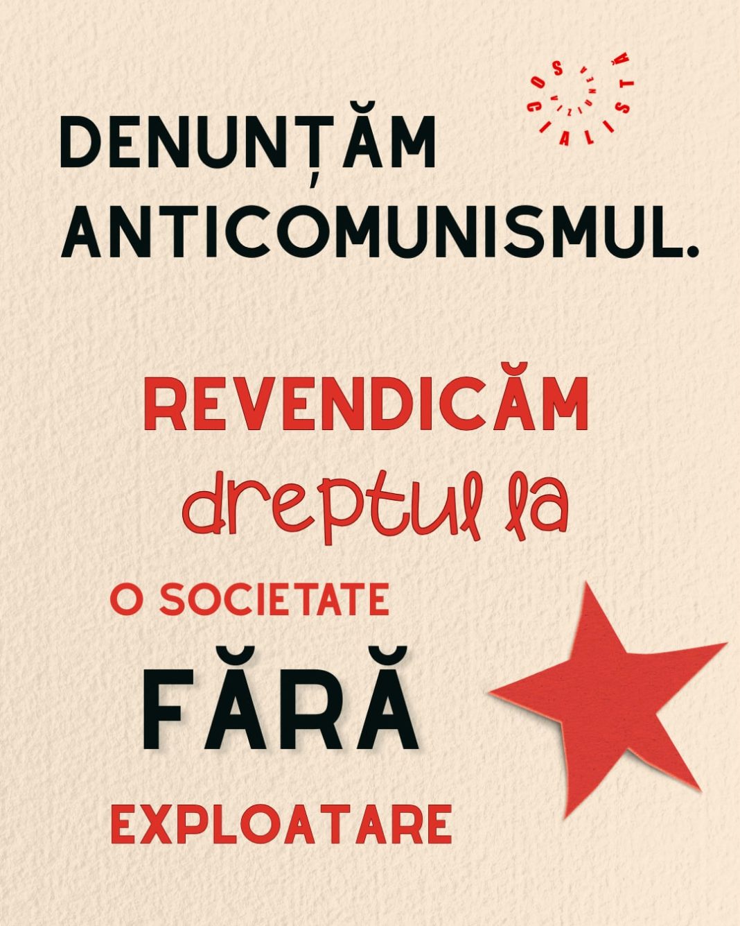 Chemăm la denunțarea fără echivoc a discursului și practicilor anticomuniste, care de trei decenii și jumătate mențin consensul pentru politica axată pe interesele capitalului și delegitimează orice încercare de organizare a celor care muncesc.