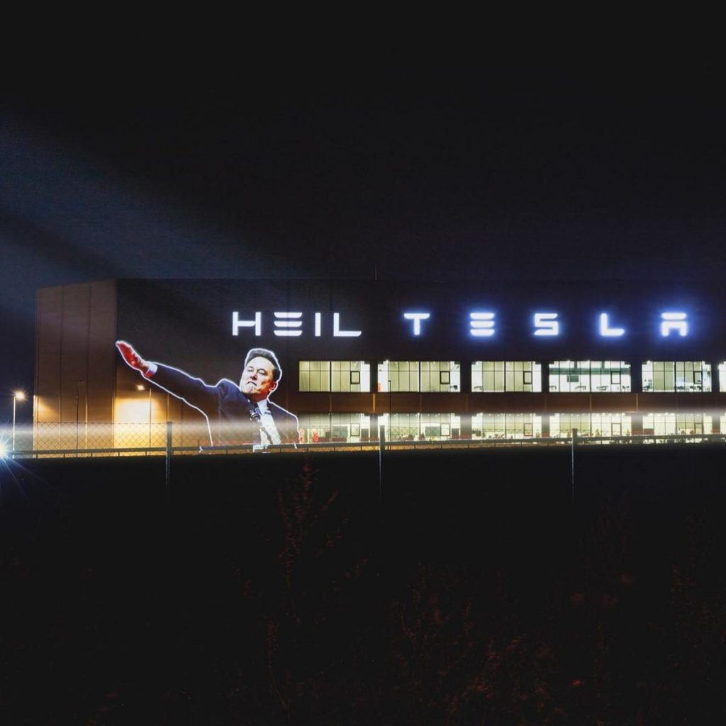 Nu orice alianță cu fasciști și potentați ai momentului dă rezultatele scontate, cum s-a văzut după ciondăneala cu Trump și Steven Bannon, și asocierea cu Trump vine și ea cu anumite riscuri, vedeți doară acțiunile puternic mediatizate din cadrul #teslatakedown. Și iată activiștii Centrului de Frumusețe Politică (Zentrul für politische Schönheit) și Led By Donkey’s proiectează un ditamai Heil Tesla pe fabrica din Grünheide bazat pe gestul acestuia la inaugurarea lui Trump și după susținerea publică a AfD-ului.